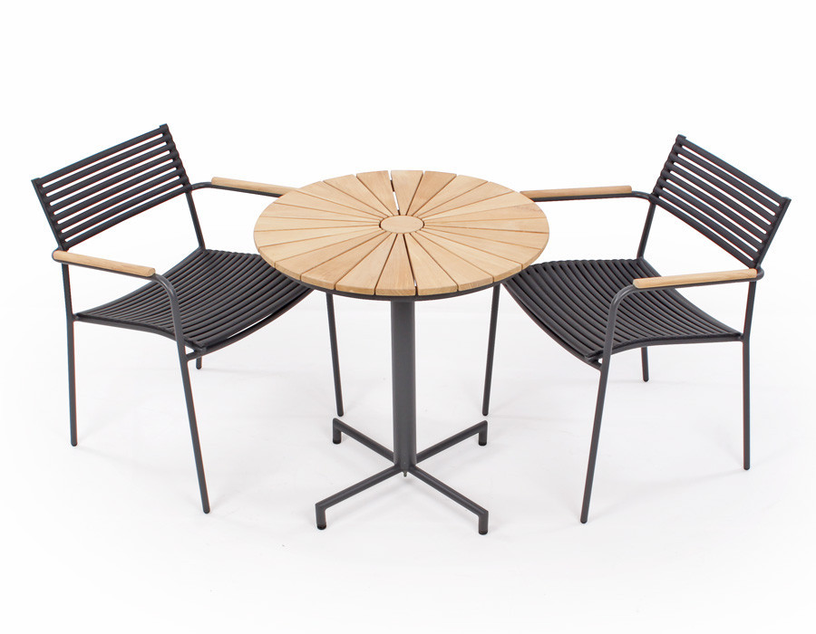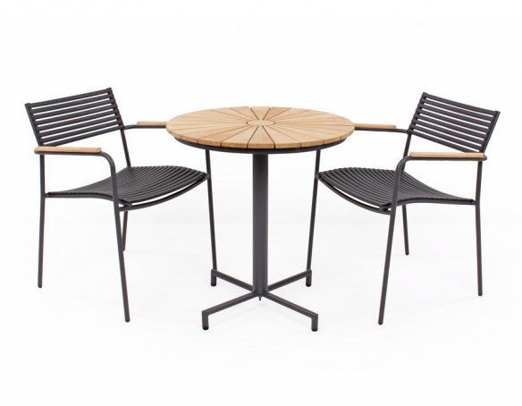 Sættet et med 2 stk. stabelstole og 70 cm. rundt bord. Antracitgråt aluminiumsstel med teaktræs lameller i super kvalitet.