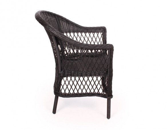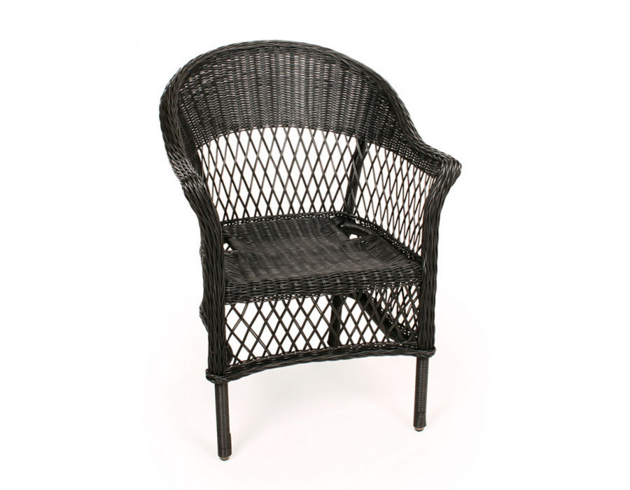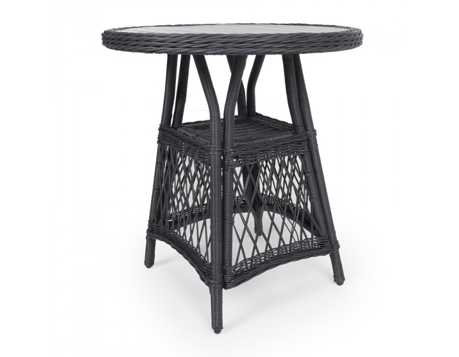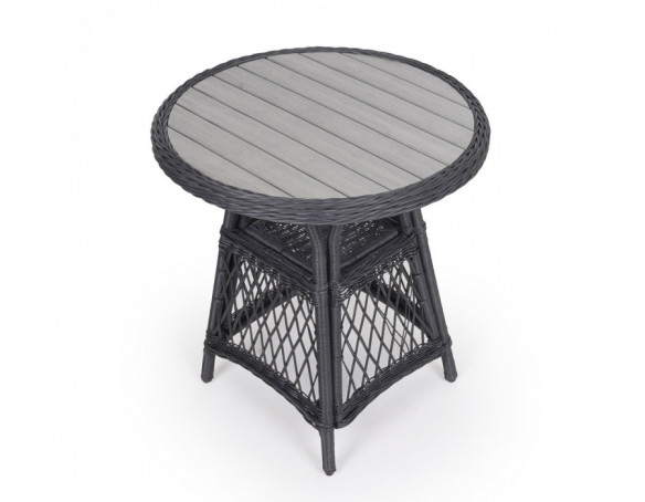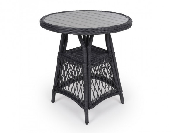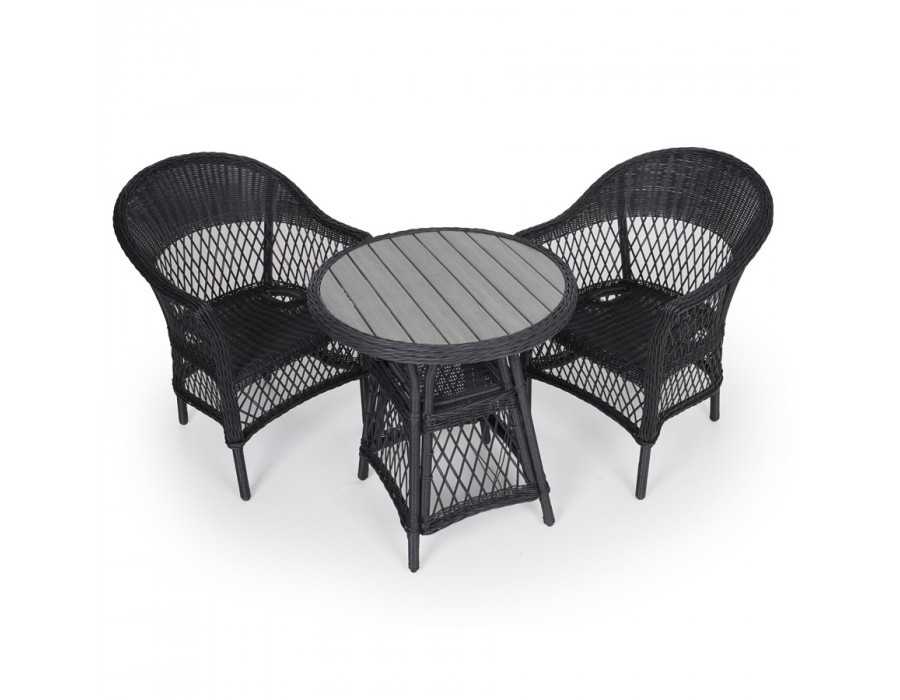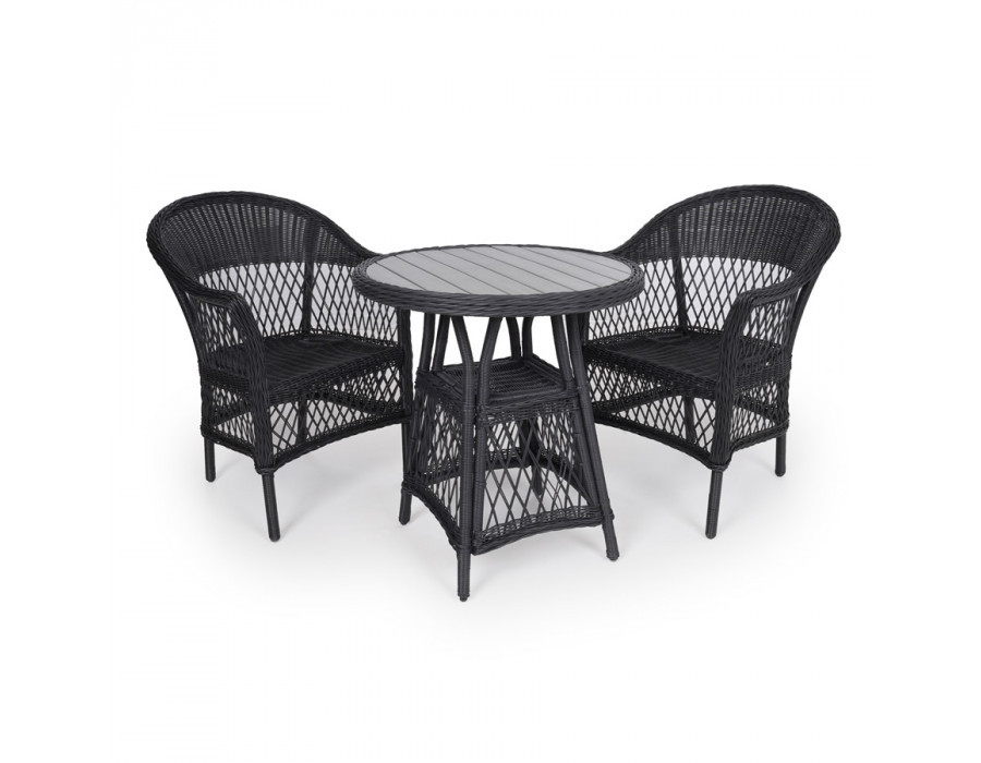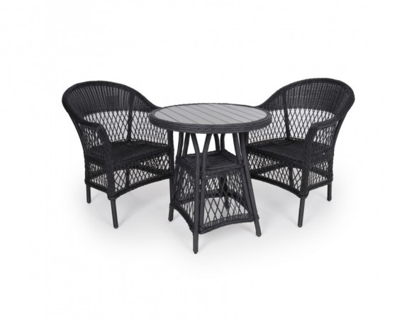 Fint sæt med 2 stk. Enø stabelstole og rundt cafebord Ø 70 cm med nonwood lameller. Alt i elegant kraftig sort polyrattan flet.