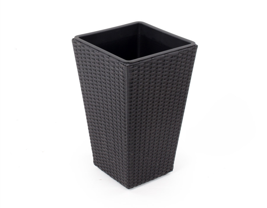 Plantekrukke fremstillet i sort polyrattan flet. Indsats i sort plast. Vi anbefaler at lægge noget tungt i bunden af krukken, så den står mere stabilt.Mål:L: 30 x B: 30 x H: 50 cm