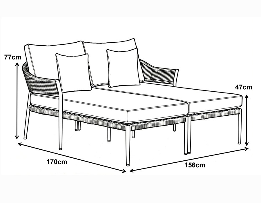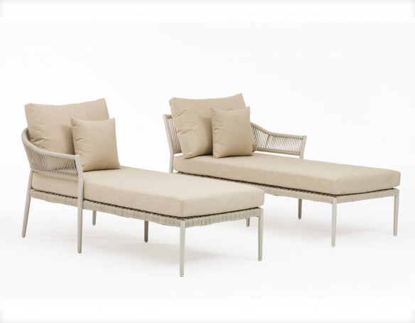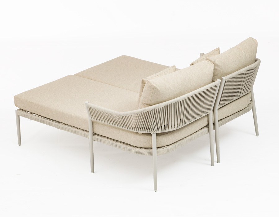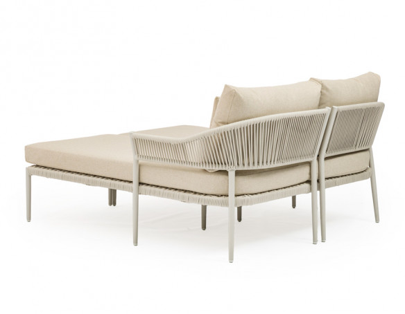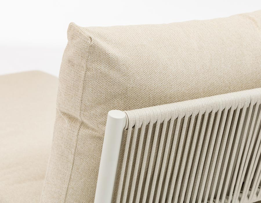 Udtrykket er let og eksklusivt med et slankt stel i aluminium, der gør møblet nemt at flytte rundt på. De elegante sider og detaljer er flettet i slidstærkt polyesterreb, som giver et moderne, luftigt look og samtidig er skabt til udelivet. Hynderne fuldender komforten med en blød, støttende følelse – og som en ekstra bonus er de vandafvisende, så du ikke behøver at gå i panik over dug eller en lille sommerbyge.