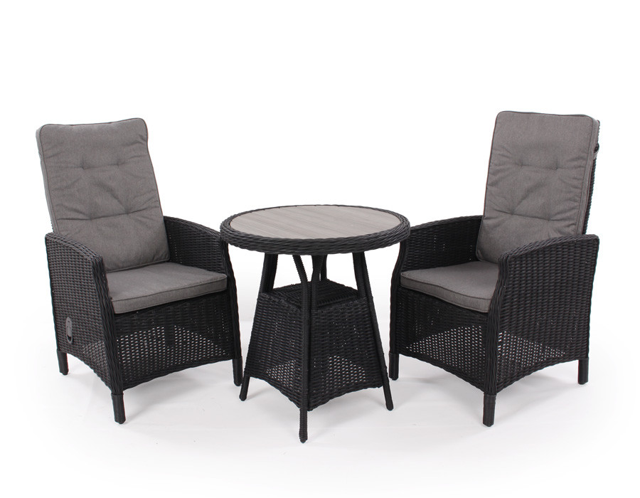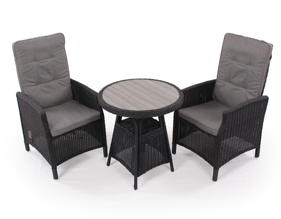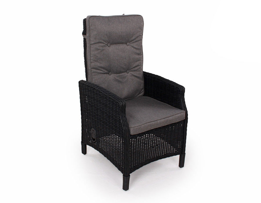 I aluminium med kraftig sort polyrattan flet. Incl. grå luksus-hynder med vandafvisende betræk. 100% vedligeholdelsesfri.Mål:Højde: 110 cmBredde: 57 cmSædedybde: 48 cmSædebredde: 48 cmSædehøjde (incl. hynde): 48 cmHøjde armlæn: 66 cm