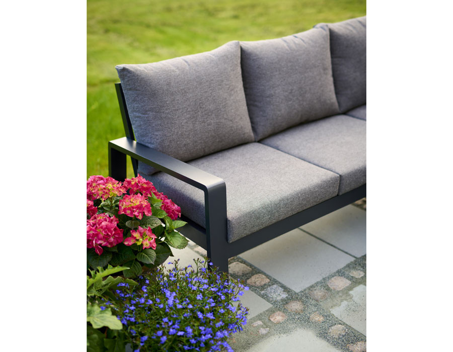 Enkelt solvogn med stel i sort aluminium og textiline. Med lækre grå hynder med vandafvisende betræk.