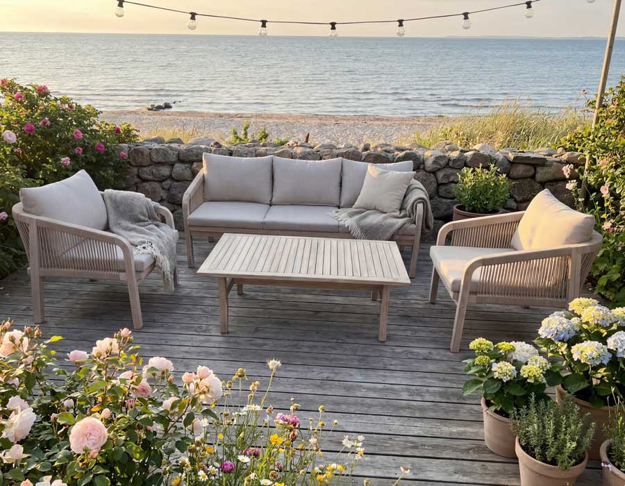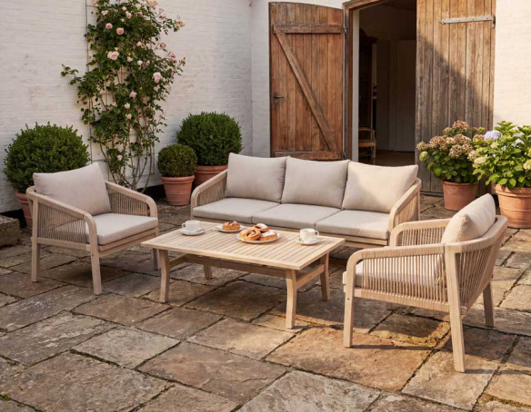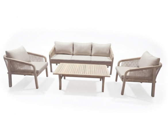 Superflot loungesæt bestående af 3-personers sofa, 2 loungestole samt sofabord. Sættet har et let og indbydende udtryk med smukke, afrundede former, elegante rebdetaljer og et naturligt look, der passer perfekt til terrassen, haven eller uderummet.