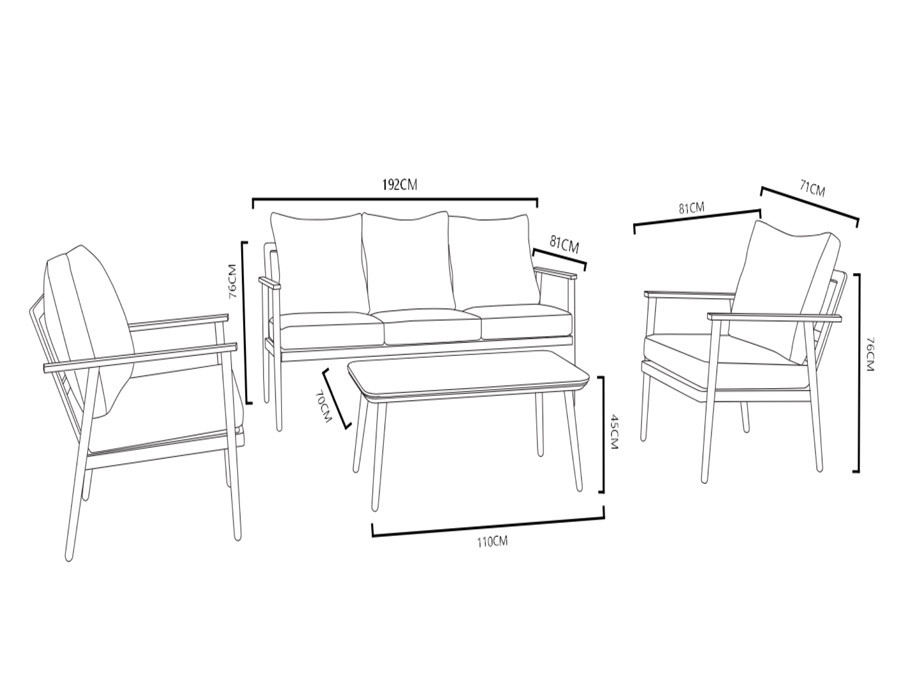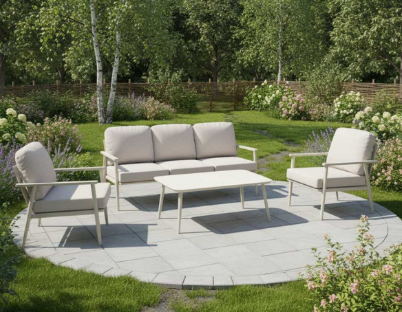 Sættet består af en rummelig 3-personers sofa, to komfortable loungestole og et matchende sofabord, der samler hele udtrykket. Bordpladen i 9 mm sintret sten har en flot, stenlignende overflade. De ekstra tykke hynder (10 cm) giver en dejlig blød siddeoplevelse, så du får lyst til at blive siddende længe – uanset om det er til morgenkaffe, sommerhygge eller aftenro i solen.