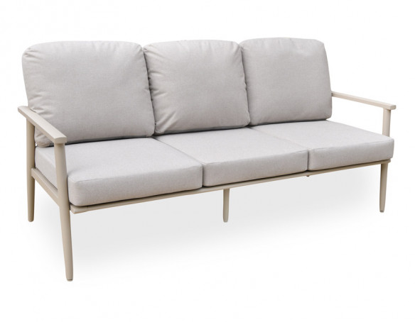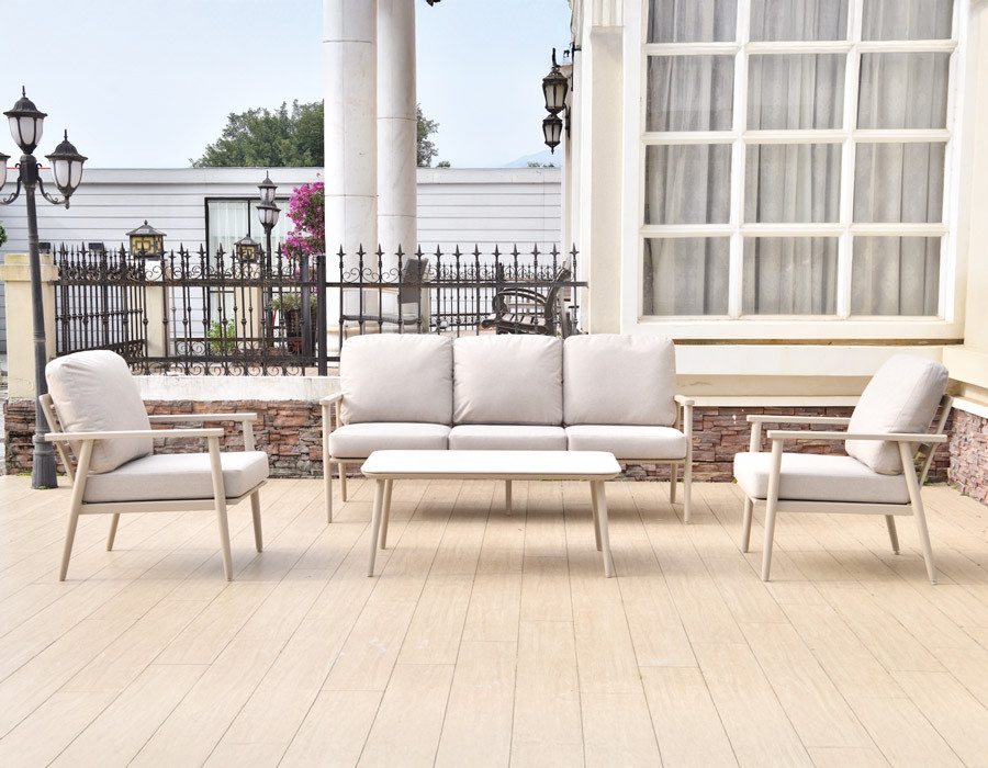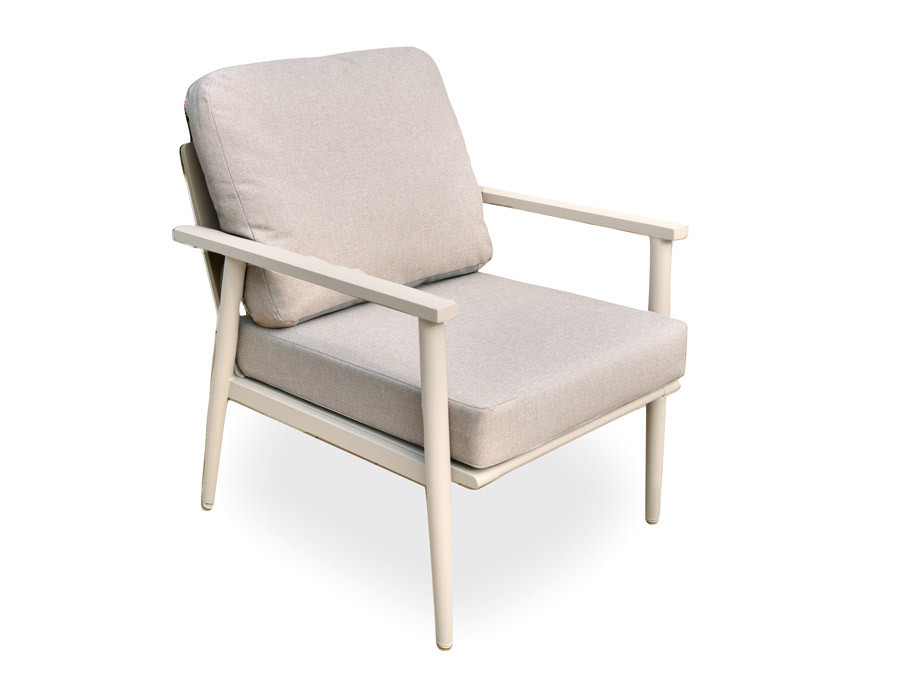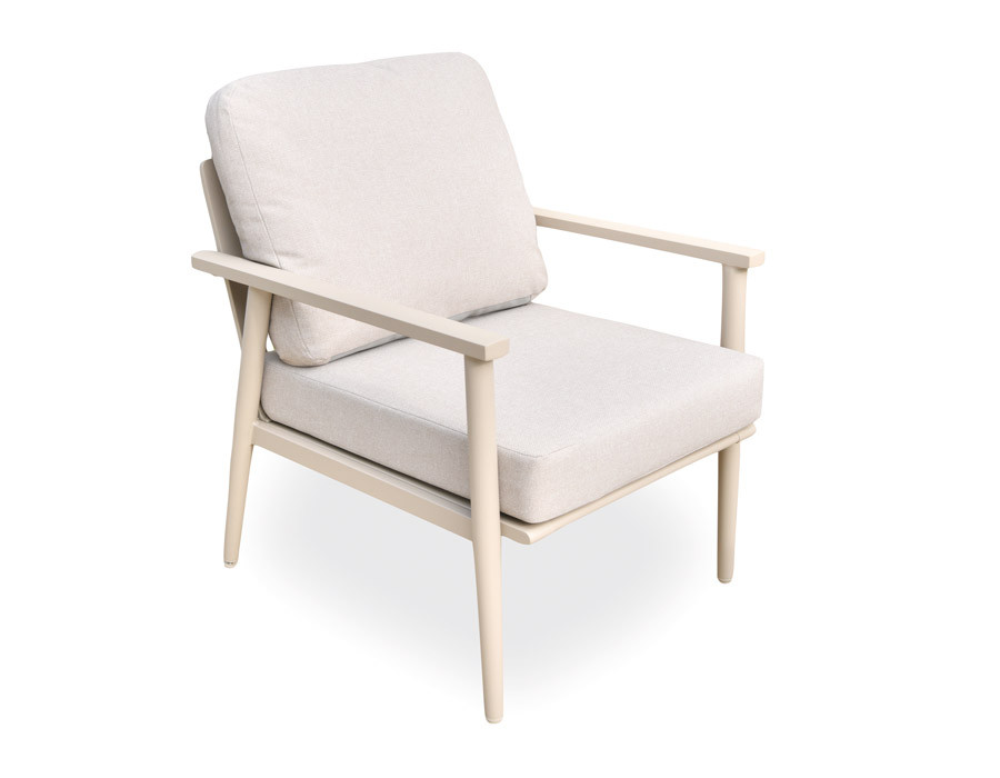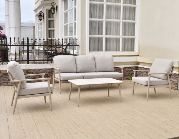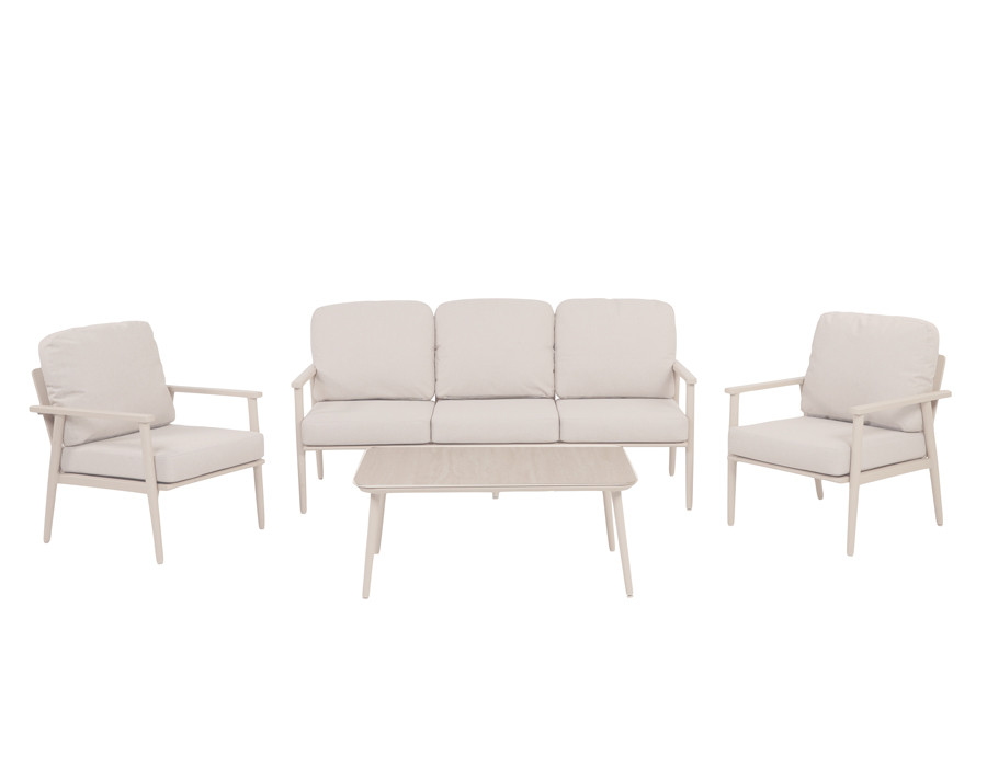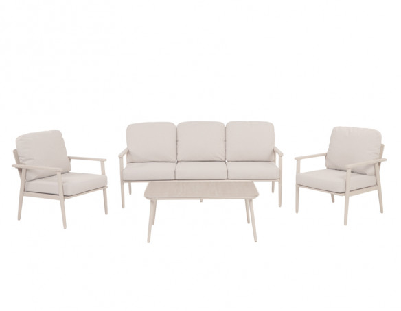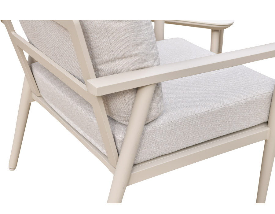Elegant loungesæt i et moderne og let udtryk. Det pulverlakerede aluminiumstel i den varme lattefarve giver et eksklusivt look og gør sættet nemt at holde pænt – perfekt til udelivet, hvor du vil have både stil og funktionalitet.