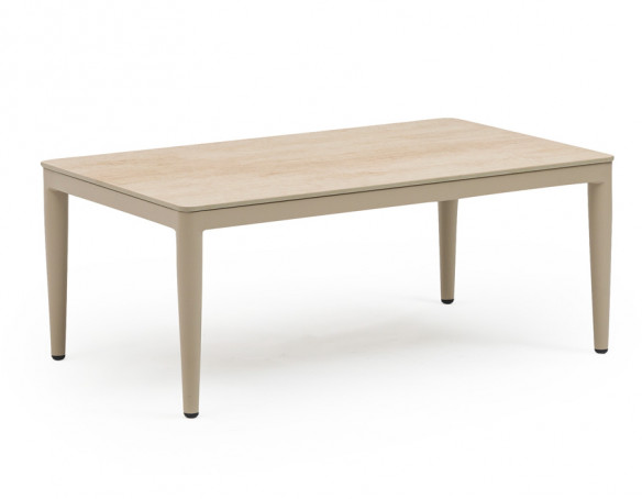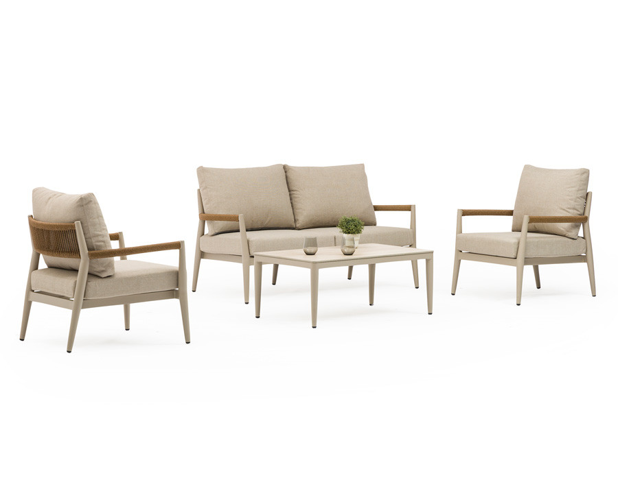 Sættet består af 2-personers sofa, to loungestole og et sofabord med slidstærk keramisk bordplade – inkl. hynder.