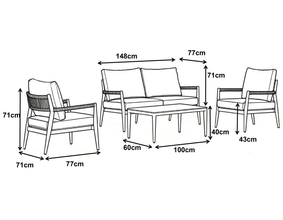 Bredde: 148 cm | Dybde: 77 cm | Højde: 71 cm | Siddehøjde: 43 cm
