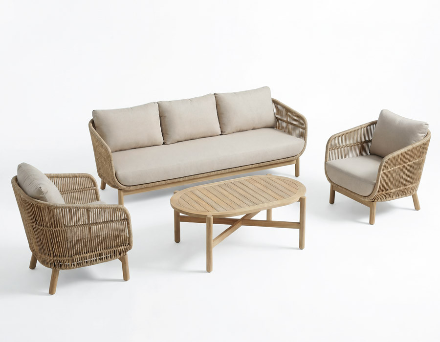 Dette lounge-sæt består af 1 sofa, 1 ovalt sofabord og 2 sofastole i Helena-serien – en indbydende løsning til terrasse og loungeområde med varme naturmaterialer. Sofaen og stolene har ben i akacietræ og er beklædt med reb i 100% polyester, som giver et let og elegant udtryk. De leveres med luksushynder i vandafvisende airflow-konstruktion med slidstærkt kvalitetsstof, vandtæt TPU-belægning på bagsiden og skum, der lader luften cirkulere og mindsker risikoen for fugt i hynderne.