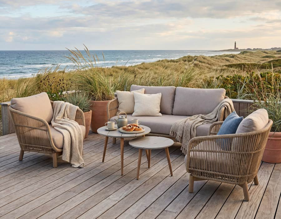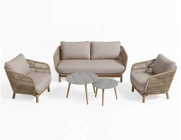 Sofa og stole har stel i aluminium betrukket med flettet polyesterreb og ben i akacietræ, som tilfører et...