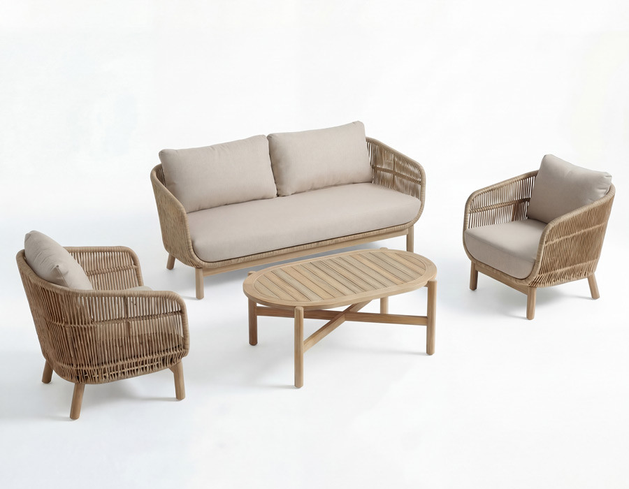 Sofa og stole har stel i aluminium betrukket med flettet polyesterreb og ben i akacietræ, som tilfører et...