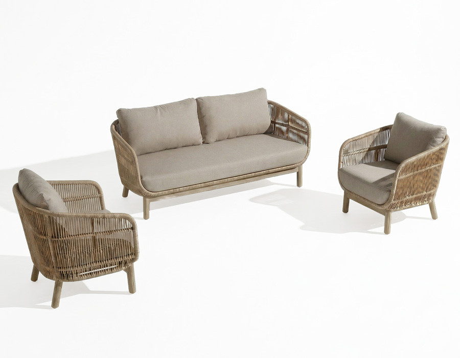 Sofa og stole har stel i aluminium betrukket med flettet polyesterreb og ben i akacietræ, som tilfører et...