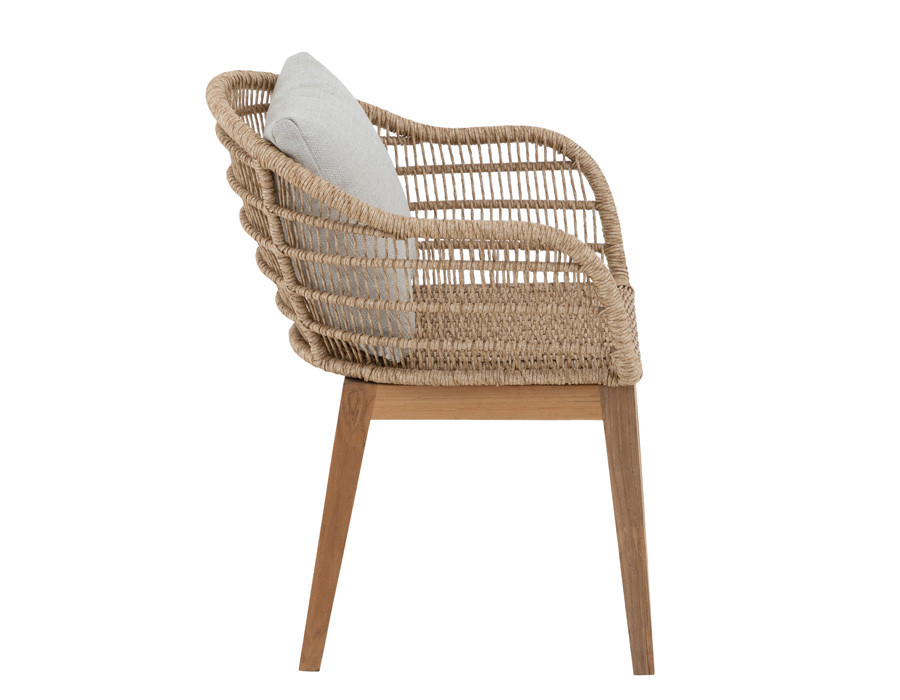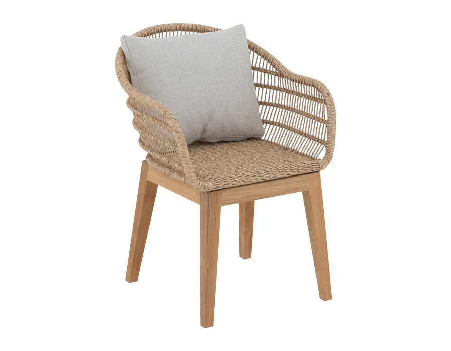 Denne stol kombinerer varme naturmaterialer med et let, moderne udtryk. Stellet er fremstillet i certificeret kerneteak, som giver en solid base og et smukt, naturligt farvespil, der passer perfekt til uderummet.