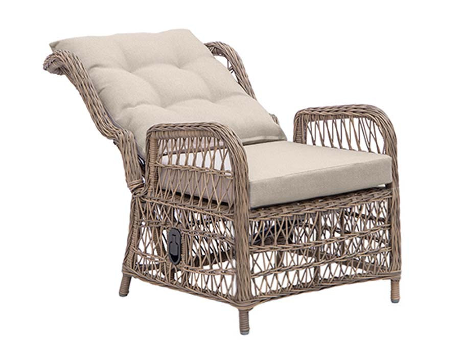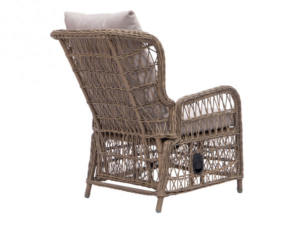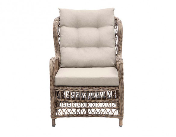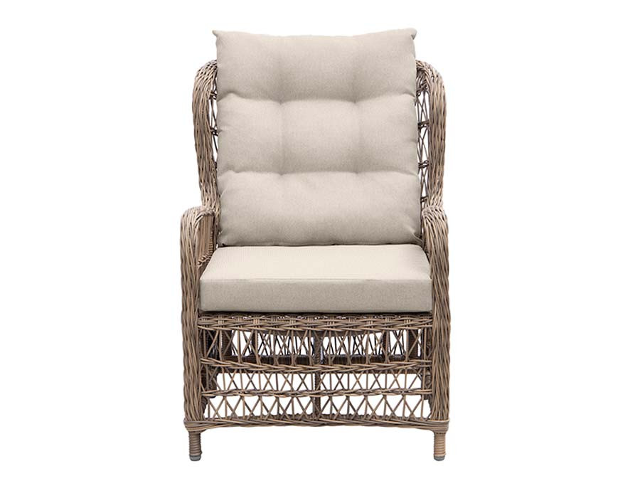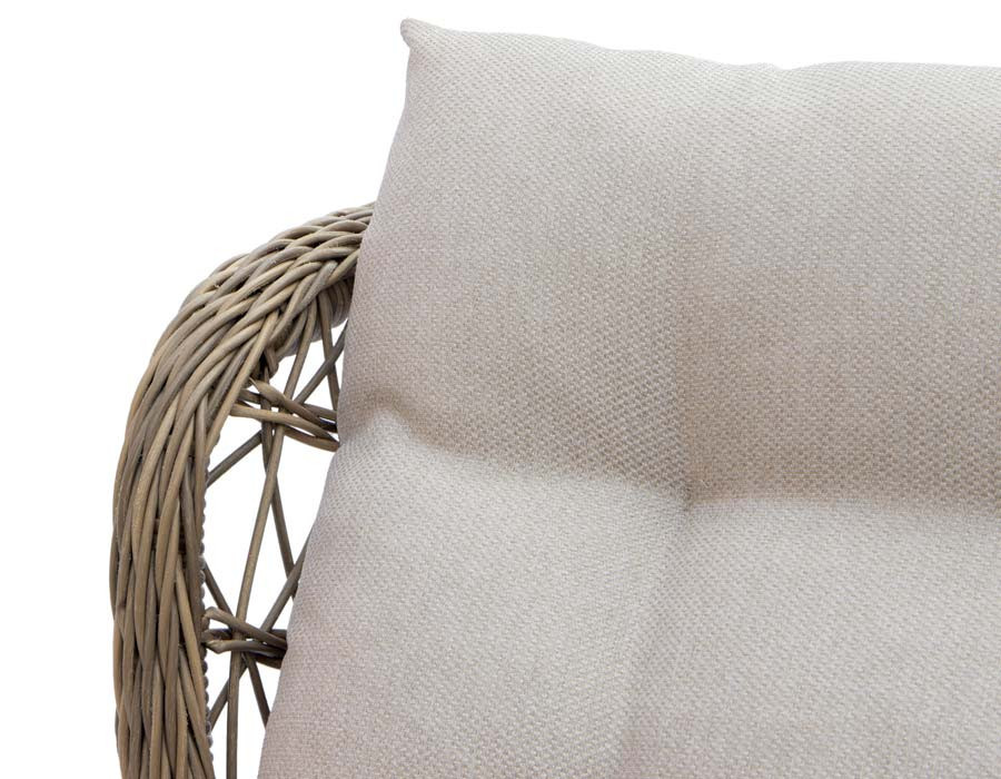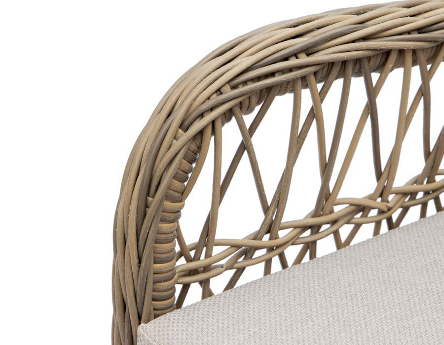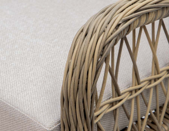 Fremstillet i kraftig dusty polyrattan-flet og incl. sandfarvede luksushynder.