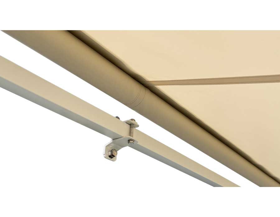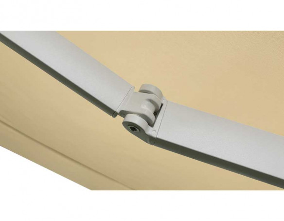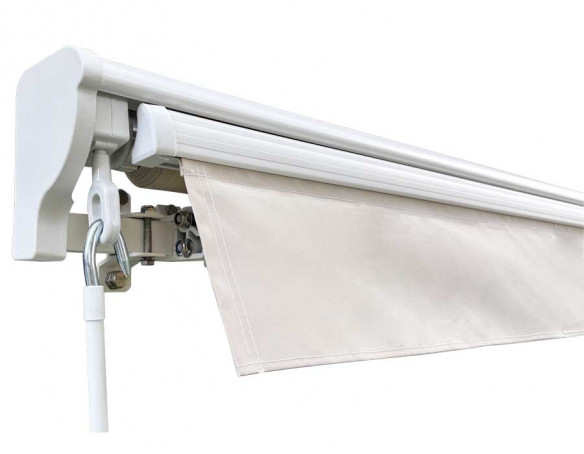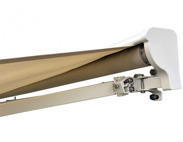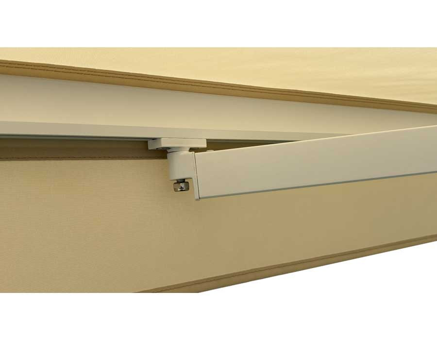 Markisen er en semikassette-model med motor og fjernbetjening, så den betjenes let og hurtigt. Den solide konstruktion i aluminium kombineret med stål torsionsstang giver god stabilitet, og semikassetten hjælper med at beskytte dugen, når den rulles ind.