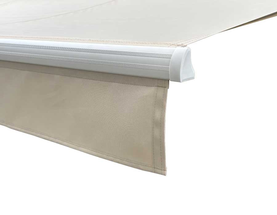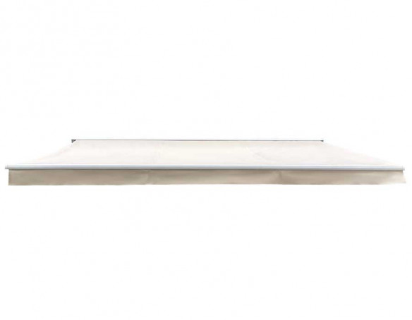 Bøg Markise i hvid/beige er en fuldkassette-markise m/motor, fjernbetjening og integreret LED-lys, til en hyggelig stemning, når mørket falder på.