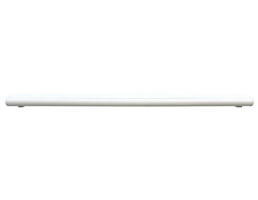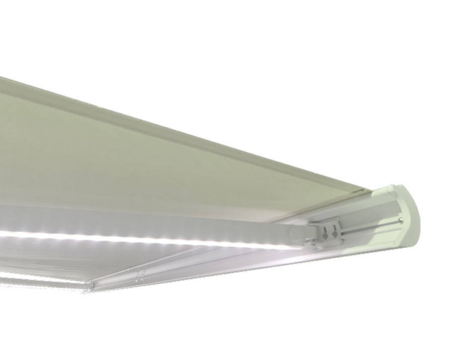 Skab en lun og stemningsfuld terrasse med Bøg Markise i hvid/beige – en fuldkassette-markise med motor, fjernbetjening og integreret LED-lys.