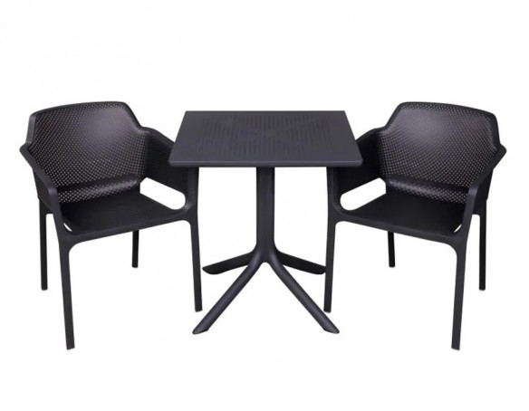 Dette café-/lounge-sæt fra Nardi i antracit kombinerer Spritz bord og Bora stabelstole i et stilrent, moderne udtryk til terrasse, altan og udeservering.