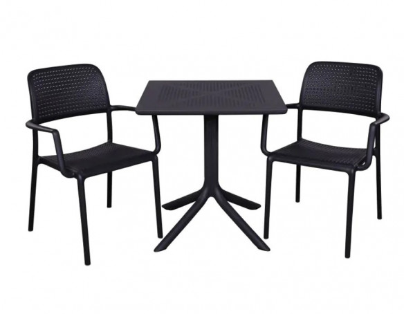 Dette café-/lounge-sæt fra Nardi i antracit kombinerer Spritz bord og Bora stabelstole i et stilrent, moderne udtryk til terrasse, altan og udeservering.