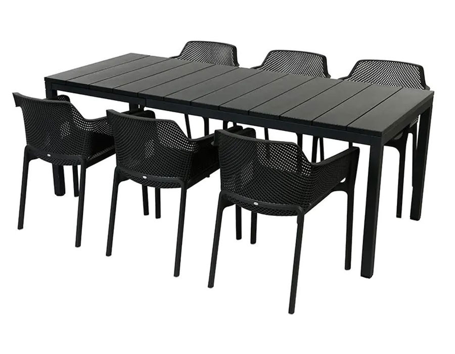 Dette havemøbelsæt fra Nardi består af det store Rio udtræksbord og Net stabelstole i antracit – et moderne, markant look til rummelige terrasser.