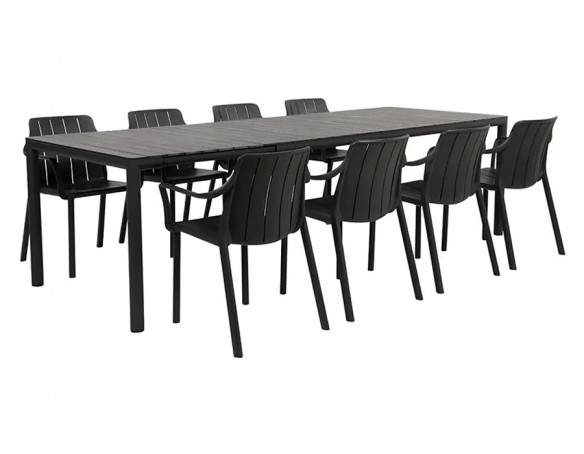 Dette udendørssæt fra Nardi består af det store Tevere udtræksbord og Tiberina stabelstole i antracit – et markant, mørkt udtryk med fine grå nuancer, der passer til både moderne terrasser og udeservering.