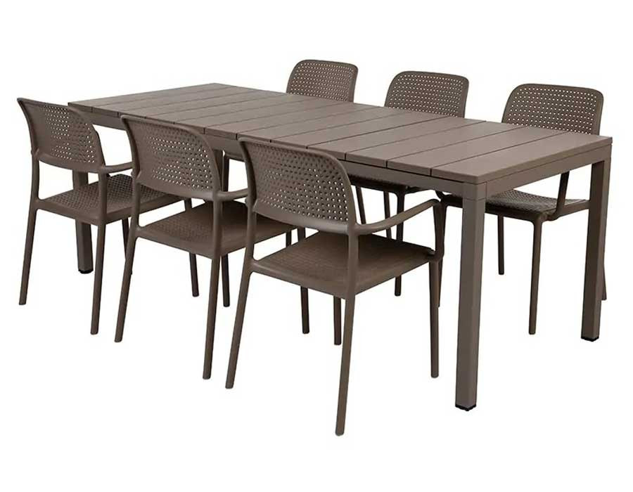 Luksussæt i italiensk design fra Nardi med 6 Bora stabelstole i farven Latte og 1 Rio udtræksbord (140 × 210 × 85 cm).