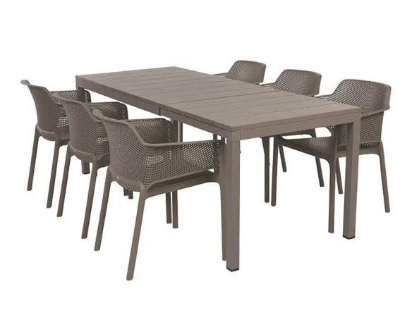 Dette havemøbelsæt fra Nardi i farven Latte kombinerer Rio udtræksbord og Net stabelstole i et lyst, roligt udtryk til terrasse og uderum.