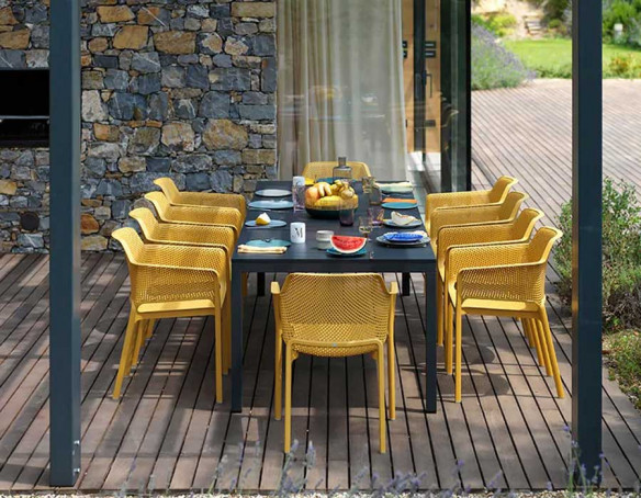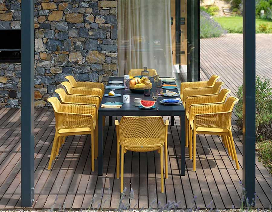 Sættet består af 8 Net stabelstole i farven Sennep og et Rio udtræksbord i antracit, som giver en flot kontrast mellem varmt og mørkt og passer til både moderne terrasser og udeservering.