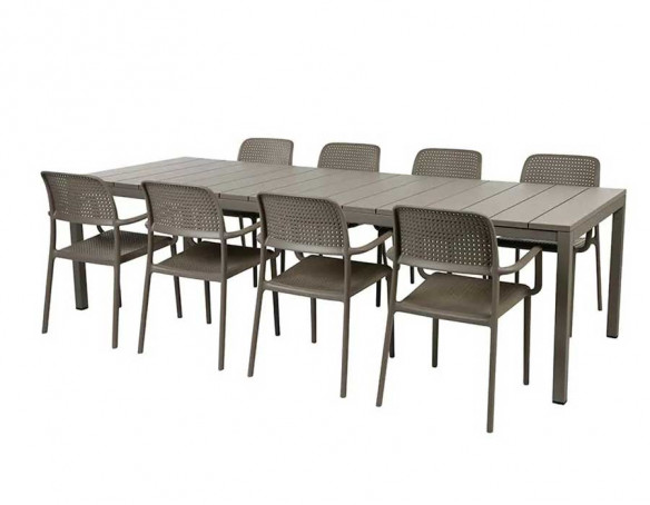 Dette udendørssæt fra Nardi i farven Latte kombinerer det store Rio udtræksbord med Bora stabelstole og skaber et lyst, elegant udtryk til terrasse og uderum.