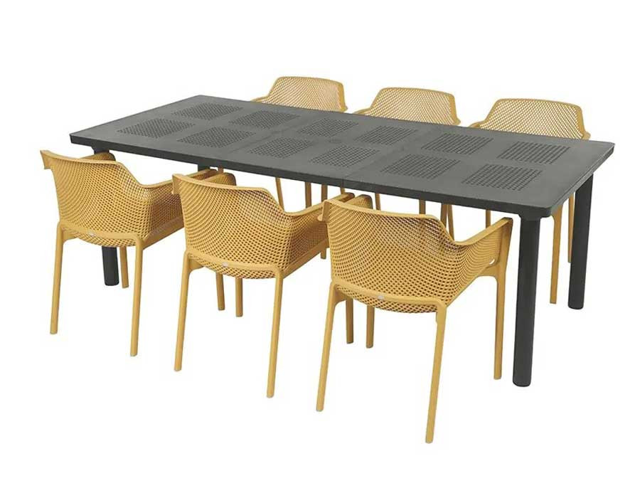 Italiensk design fra Nardi i et 100% vedligeholdelsesfrit havemøbelsæt. Sættet består af 1 Libeccio udtræksbord i antracit og 6 Net stabelstole i farven Sennep, og det fås også i andre farver.