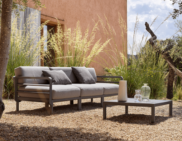De medfølgende grå hynder er betrukket med kvalitetsstof fra Sunbrella, som er kendt for sin høje farveægthed samt vand- og smudsafvisende egenskaber. Det giver et komfortabelt modul, der samtidig er praktisk i daglig brug.