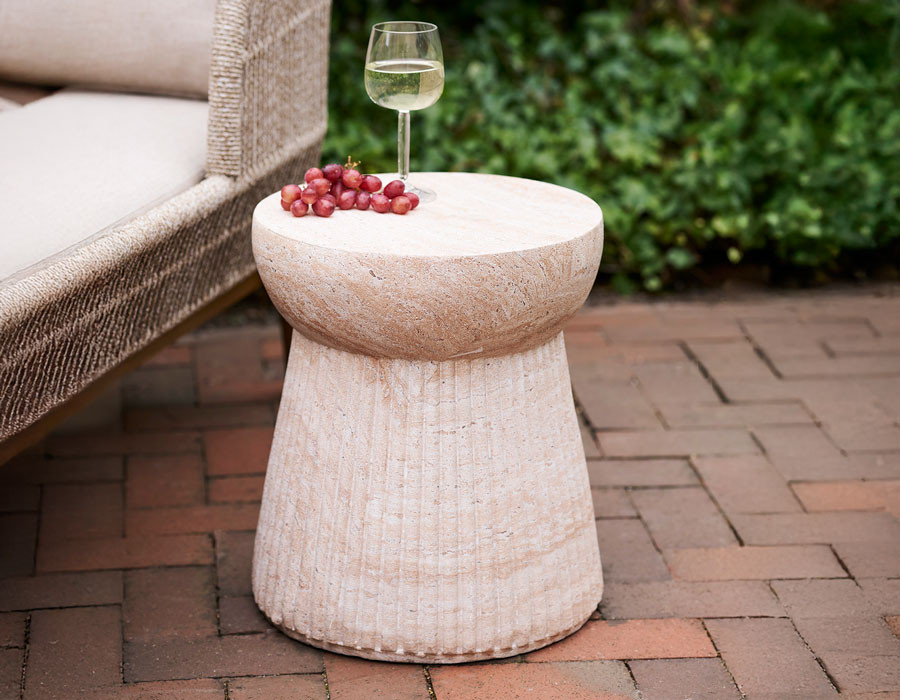 Giv din have et naturligt udtryk med det smukke Bolette sidebord. Det rillede design skaber et levende udtryk, der tilfører varme og personlighed – uanset om bordet står under åben himmel eller indenfor.