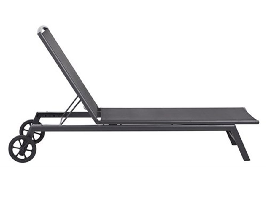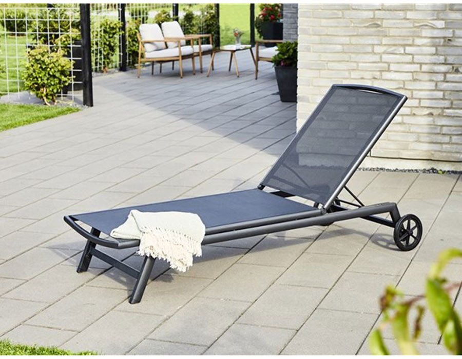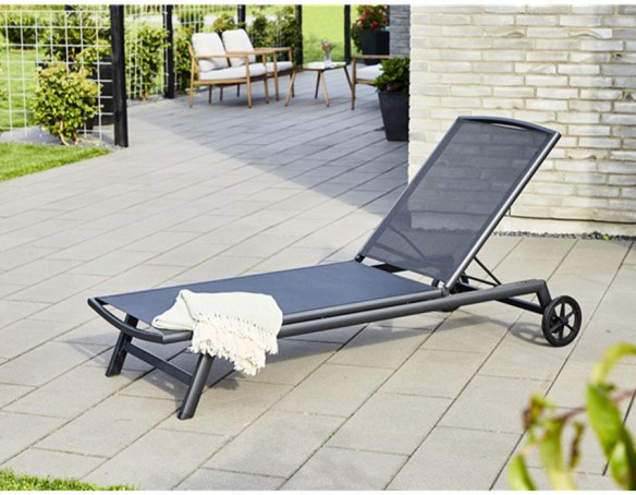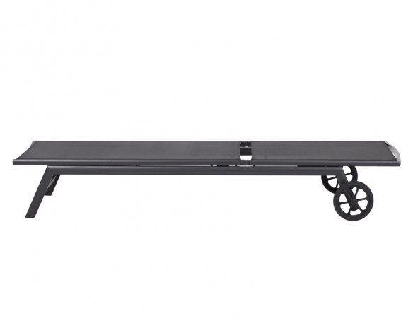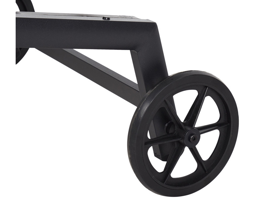Solvogn med hjul og sort textiline og aluminiumsstel.