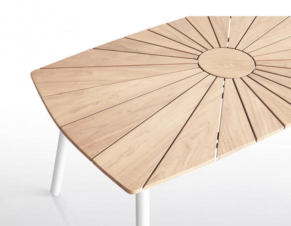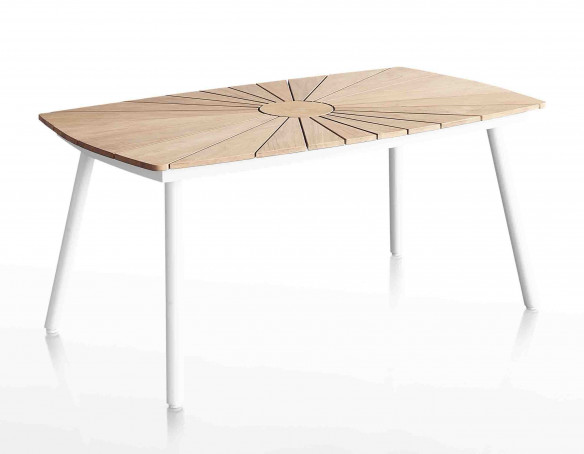 Elegant rektangulært havebord der kombinerer funktionalitet og stil. Med bordplade i flot kerne teaktræ og stel i pulverlakeret hvid aluminium.