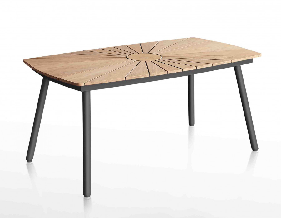 Elegant rektangulært havebord der kombinerer funktionalitet og stil. Med bordplade i flot kerne teaktræ og stel i pulverlakeret antracitgrå aluminium.