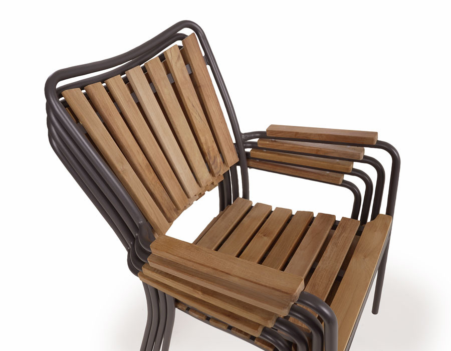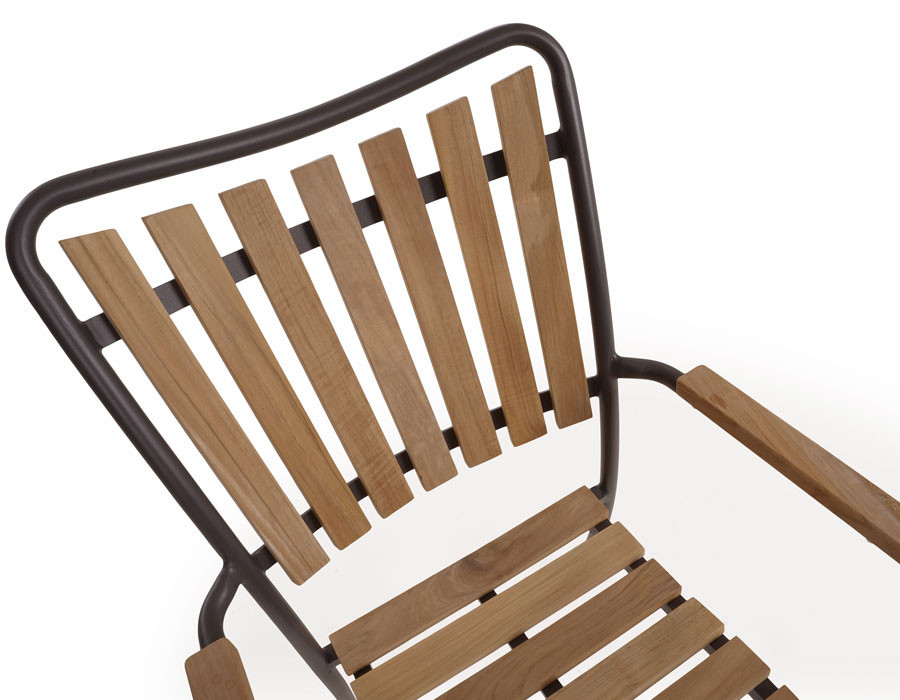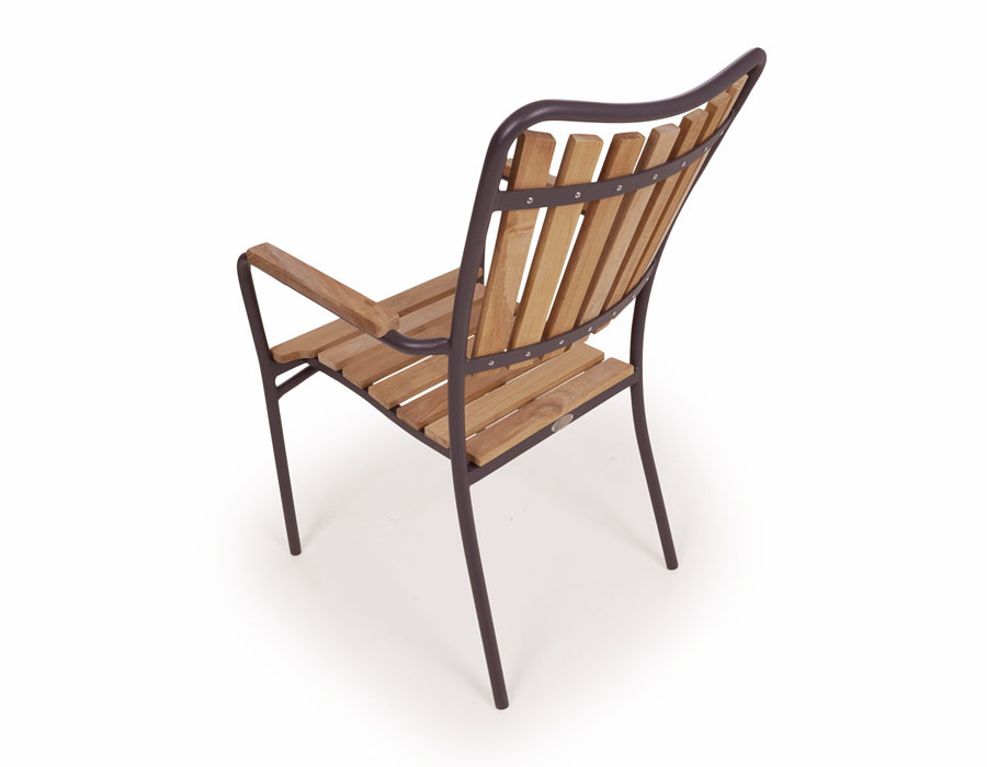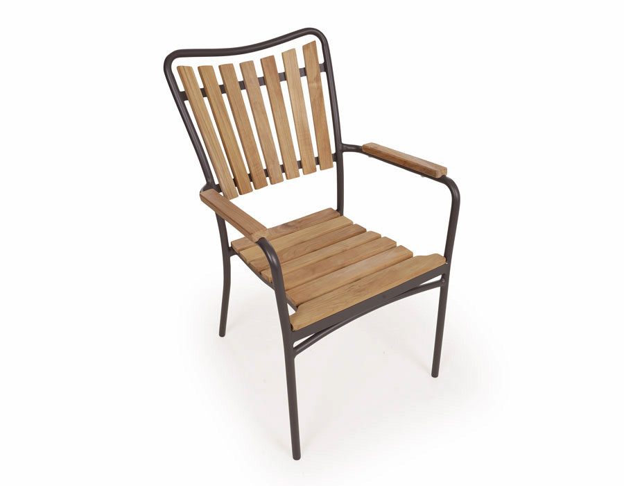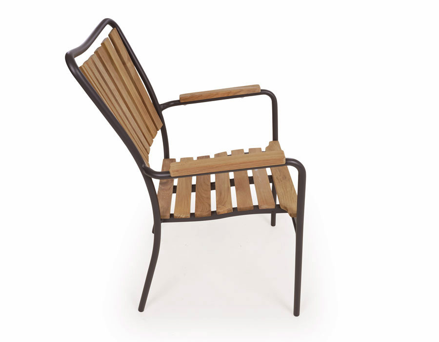 Denne stol har et elegant stel i pulverlakeret grå aluminium og er designet med et ergonomisk sæde og ryg i certificeret kvalitets teaktræ.
