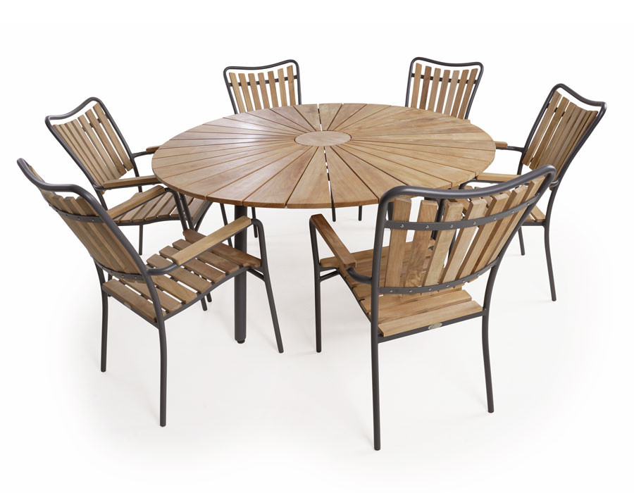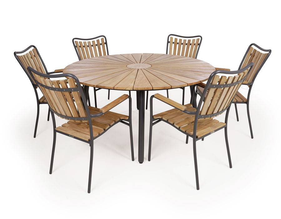 Sættet består af et rundt havebord og 5 havestole med flot certificeret kerneteak og stel i pulverlakeret antracitgråt aluminium. Certificeringen garanterer, at teaktræet er lovligt og bæredygtigt.