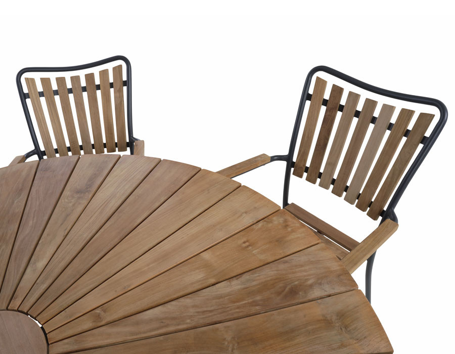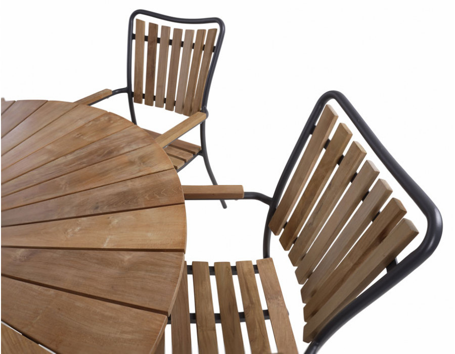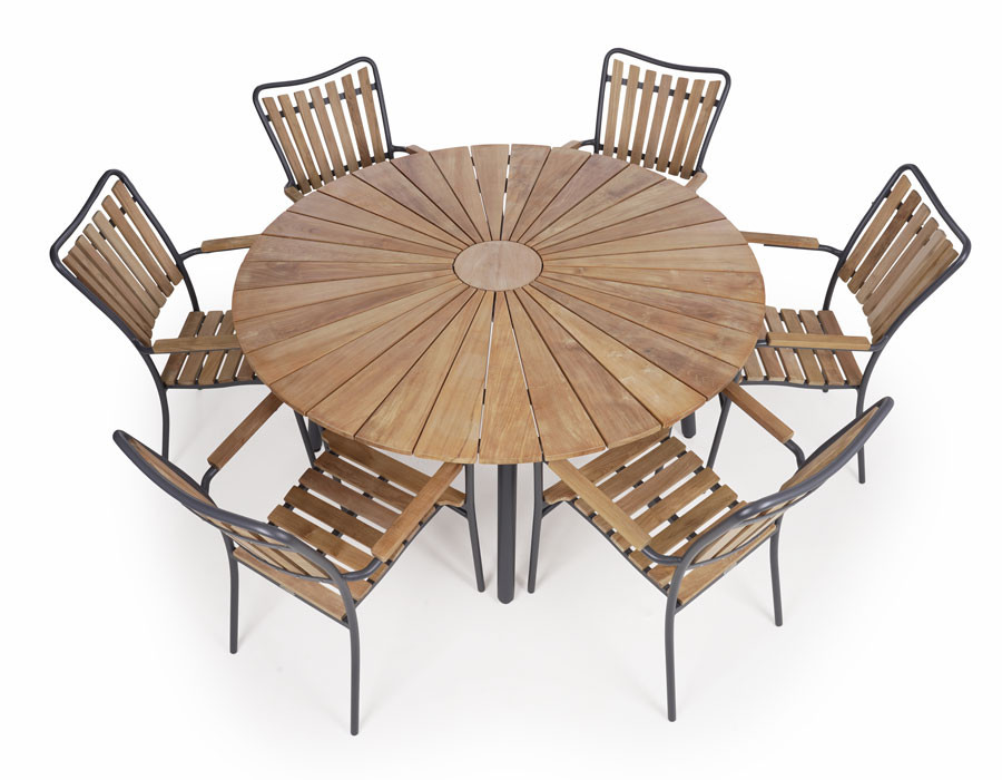 Superflot og elegant sæt med rundt bord sammen med 4 stole. Alt fremstillet i pulverlakeret antracitgråt aluminiumsstel og med flot certificeret kerne teaktræ. Certificeringen sikrer, at teaktræet er både lovligt og bæredygtigt