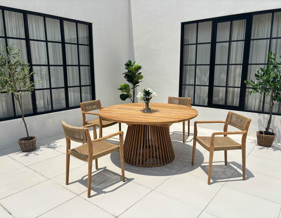 Fantastisk smukt havemøbelsæt med Luna-bord og 4 Manja stole. Alt fremstillet i kerne teaktræ fra plantage i Indonesien.