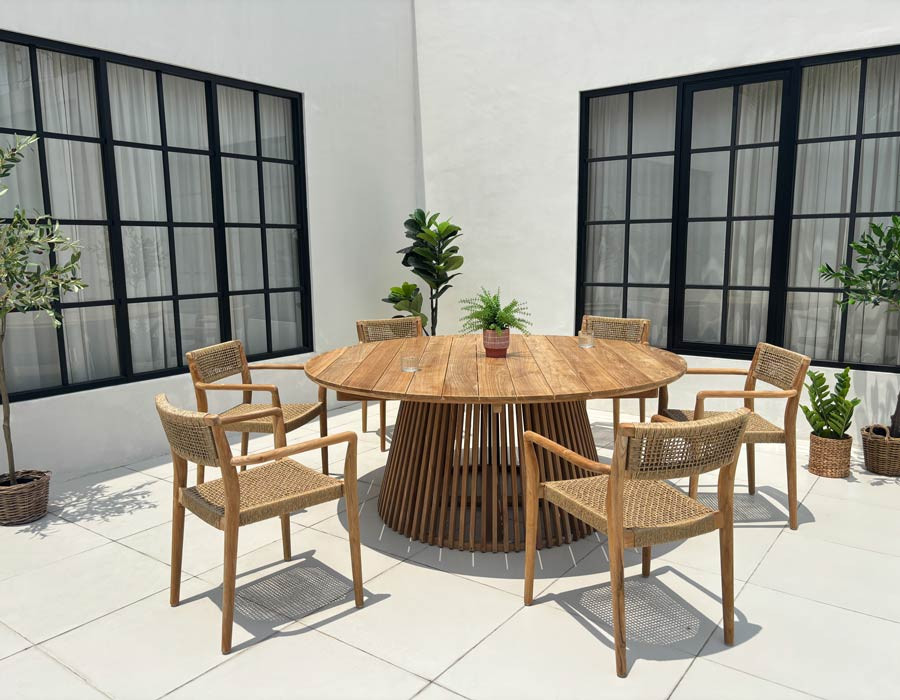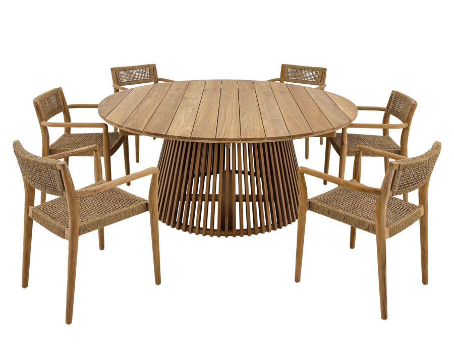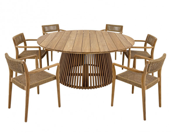 Skab en indbydende spiseplads i uderummet med et elegant teakbord og 6 Tonka havestole i varme, naturlige materialer. Bordet er fremstillet i kerneteak fra plantage i Indonesien og står på et konisk understel med lameller, som giver et let og eksklusivt udtryk, samtidig med at bordet står stabilt. Den centrale base giver fri benplads hele vejen rundt, så...