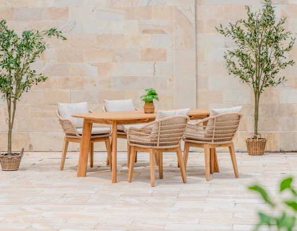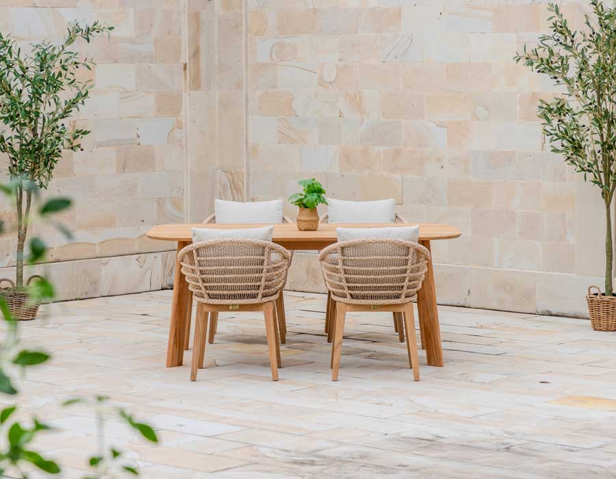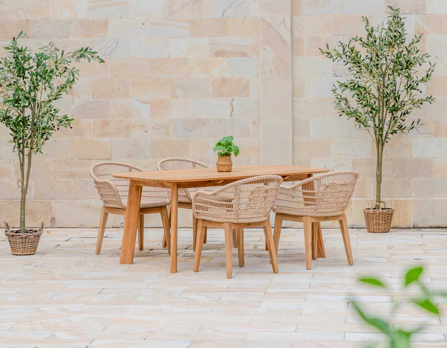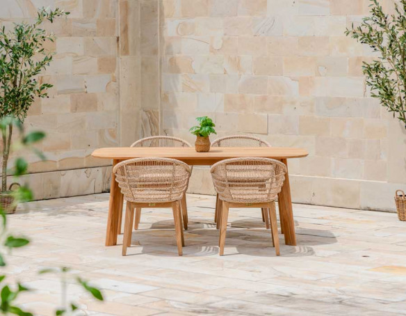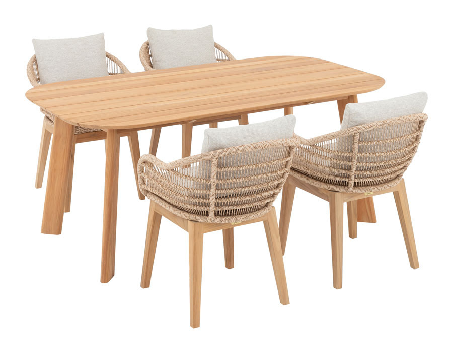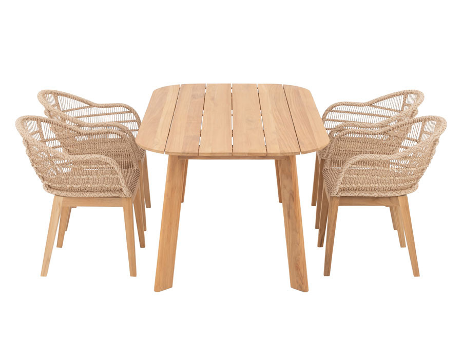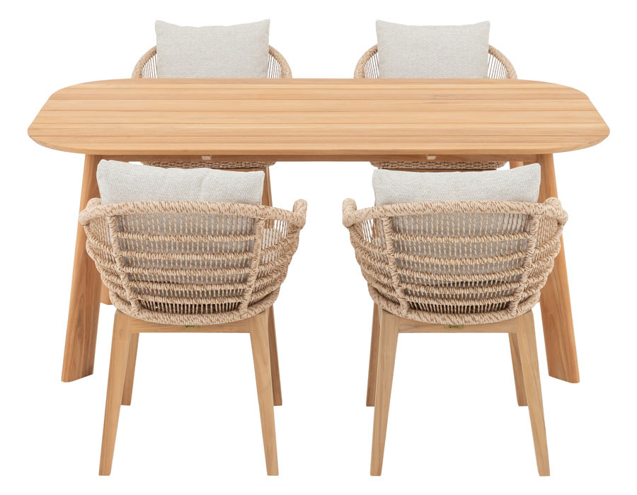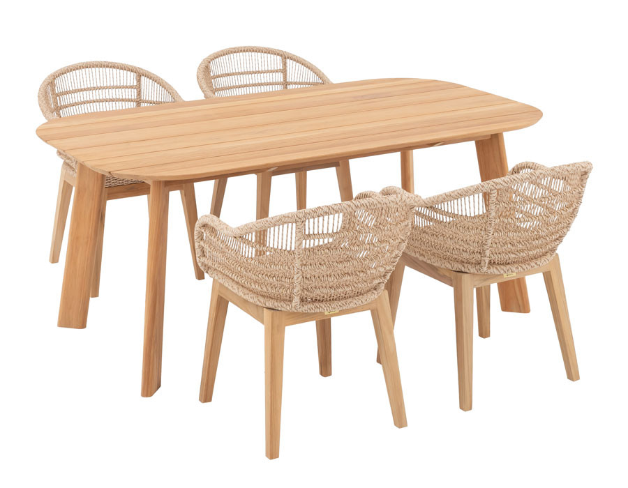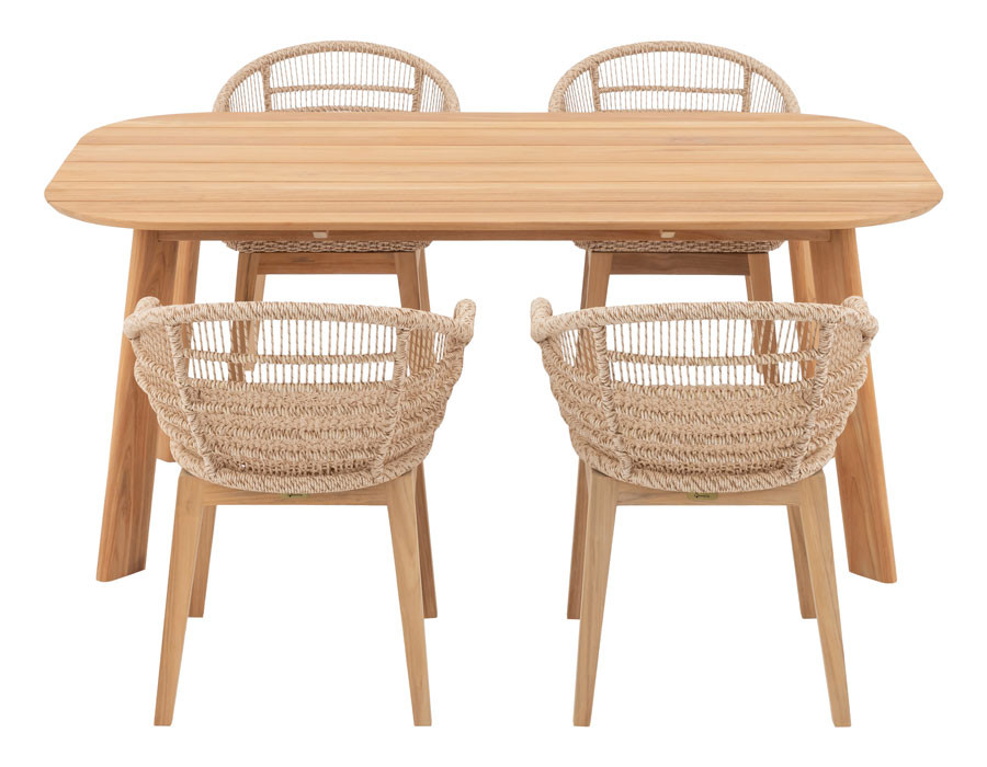 Skab en indbydende spiseplads i uderummet med Balder kerneteak havebordet og 4 Rima havestole i et harmonisk, naturligt udtryk. Bordet er udført i certificeret kerneteak og har et tidløst design med bløde, afrundede hjørner, der giver et elegant og let look på terrassen.
