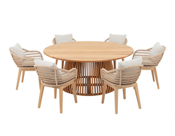 Dette luksuriøse havemøbelsæt består af et eksklusivt plankebord i teak og 6 matchende stole i teak og reb – et varmt og elegant valg til terrasse og uderum. Bordet er et massivt plankebord i kerneteak i den bedste kvalitet, udført med en bordplade i 4 brede planker, som fremhæver træets naturlige struktur og giver et roligt, eksklusivt udtryk. Den solide...