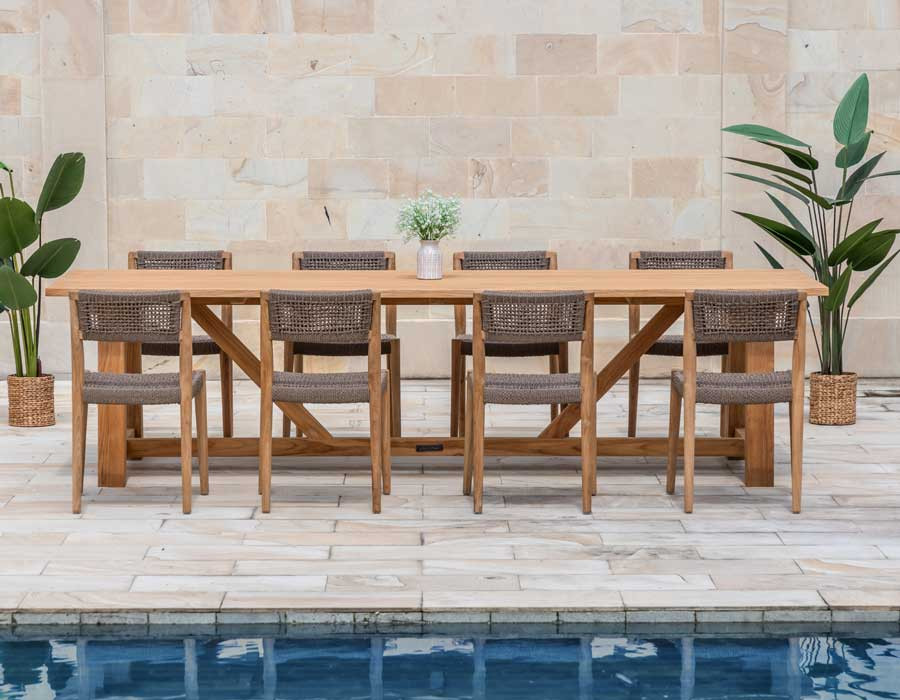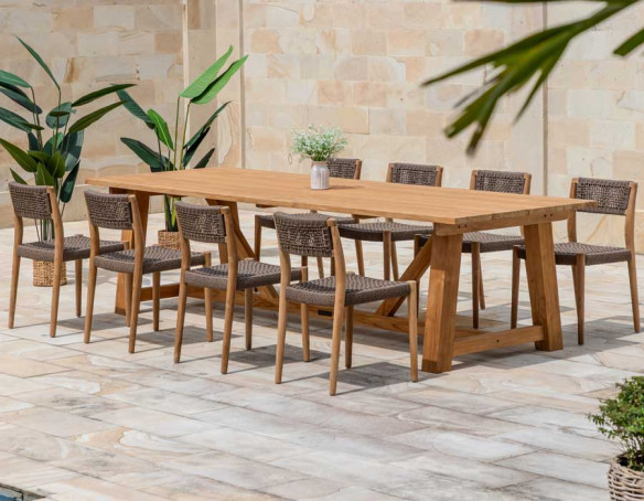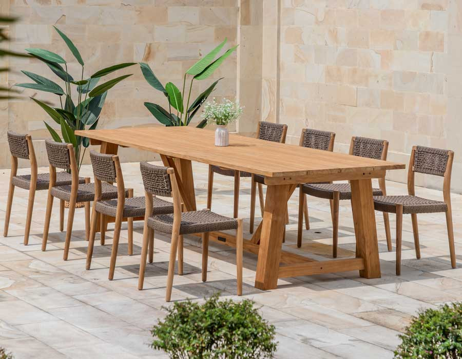 Gør terrassen klar til mange omkring bordet med et massivt teakplankebord og 8 matchende stole i varme naturmaterialer. Bordet er udført i kerneteak i høj kvalitet og har en bordplade med 4 brede planker, som skaber et roligt, tidløst plankelook og fremhæver træets smukke struktur. Den solide opbygning med kraftigt stel og afstivning giver høj stabilitet, så bordet står sikkert til både hverdagsbrug og større middage.