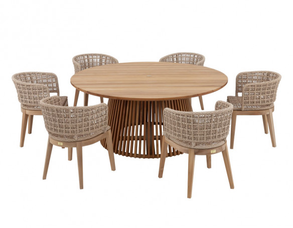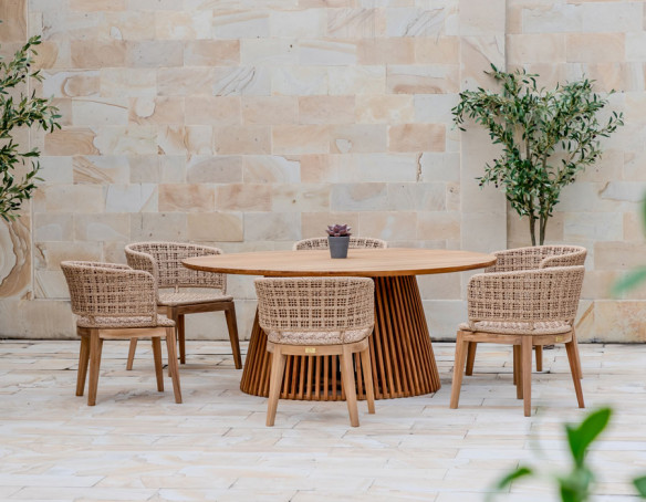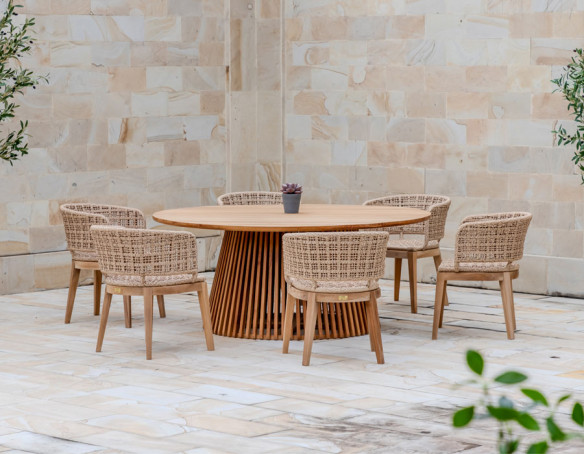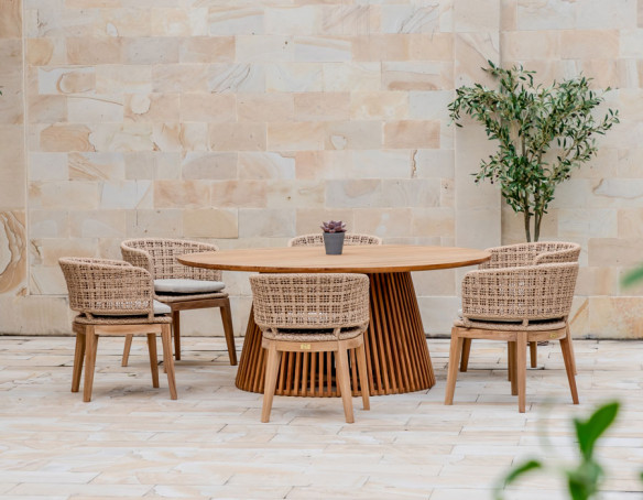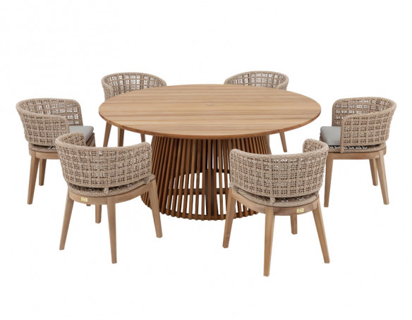 Skab en indbydende spiseplads i uderummet med dette sæt, der består af et elegant teakbord og 4 Rima havestole. Bordet er fremstillet i kerneteak fra plantage i Indonesien og står på et konisk lamelunderstel, som giver et let og eksklusivt udtryk – samtidig med at konstruktionen er stabil i daglig brug. Den centrale base giver bedre benplads hele vejen...