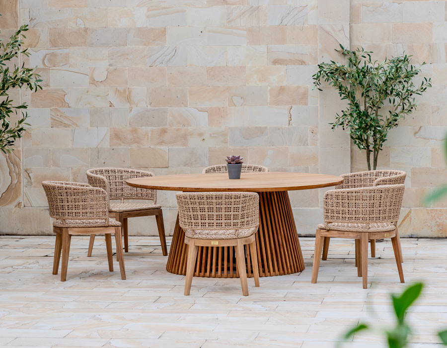 Skab en indbydende spiseplads i uderummet med Balder kerneteak havebordet og 4 Rima havestole i et harmonisk, naturligt udtryk. Bordet er udført i certificeret kerneteak og har et tidløst design med bløde, afrundede hjørner, der giver et elegant og let look på terrassen.