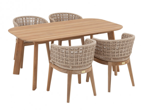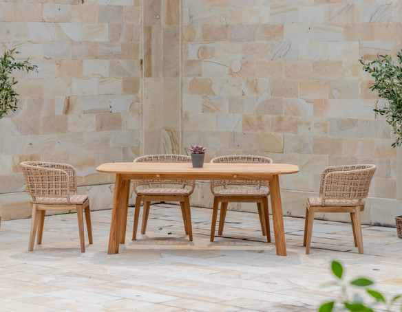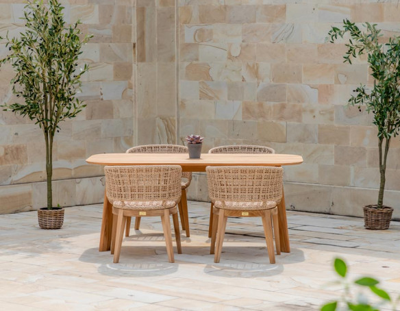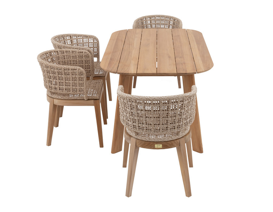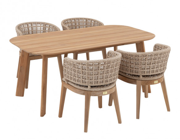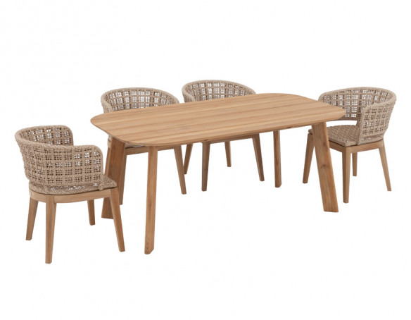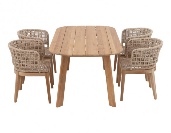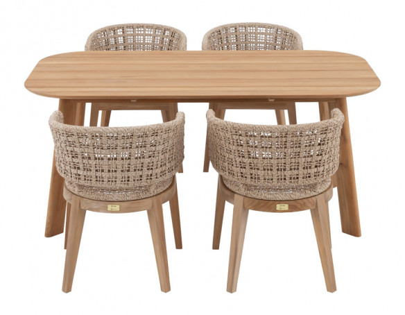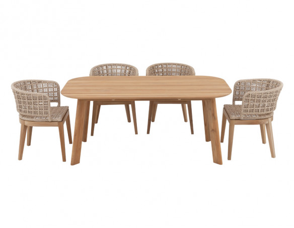 Skab en indbydende spiseplads i uderummet med Balder kerneteak havebordet og 4 Lago havestole i et harmonisk, naturligt udtryk. Bordet er udført i certificeret kerneteak og har et enkelt, tidløst design med bløde, afrundede hjørner, der giver et let og elegant look på terrassen.