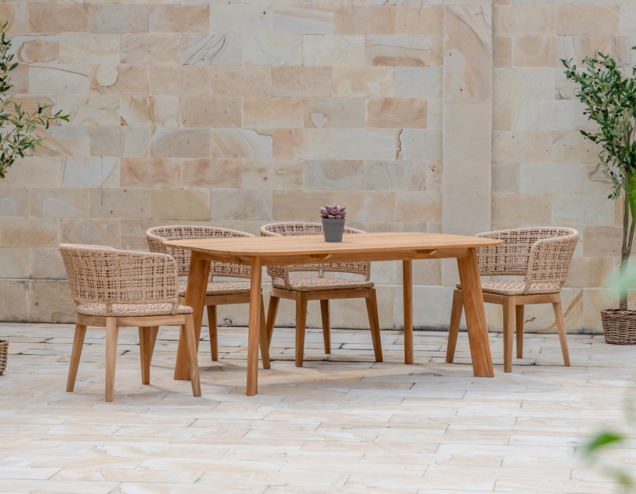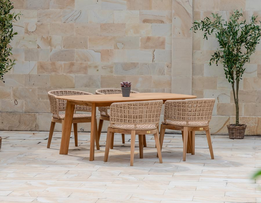 Rima havestolen kombinerer varme naturmaterialer med et let og elegant udtryk. Det solide stel i certificeret kerneteak giver stolen en stabil base og fremhæver træets smukke, naturlige farvespil.