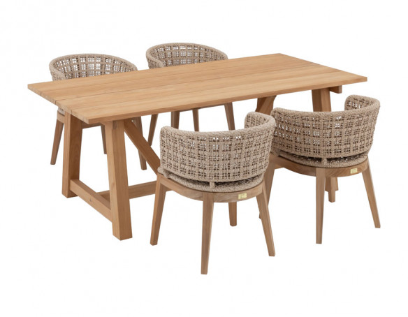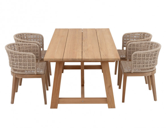 Skab en indbydende spiseplads i uderummet med dette sæt, der består af et elegant teakbord og 4 Rima havestole. Bordet er fremstillet i kerneteak fra plantage i Indonesien og står på et konisk lamelunderstel, som giver et let og eksklusivt udtryk – samtidig med at konstruktionen er stabil i daglig brug. Den centrale base giver bedre benplads hele vejen...
