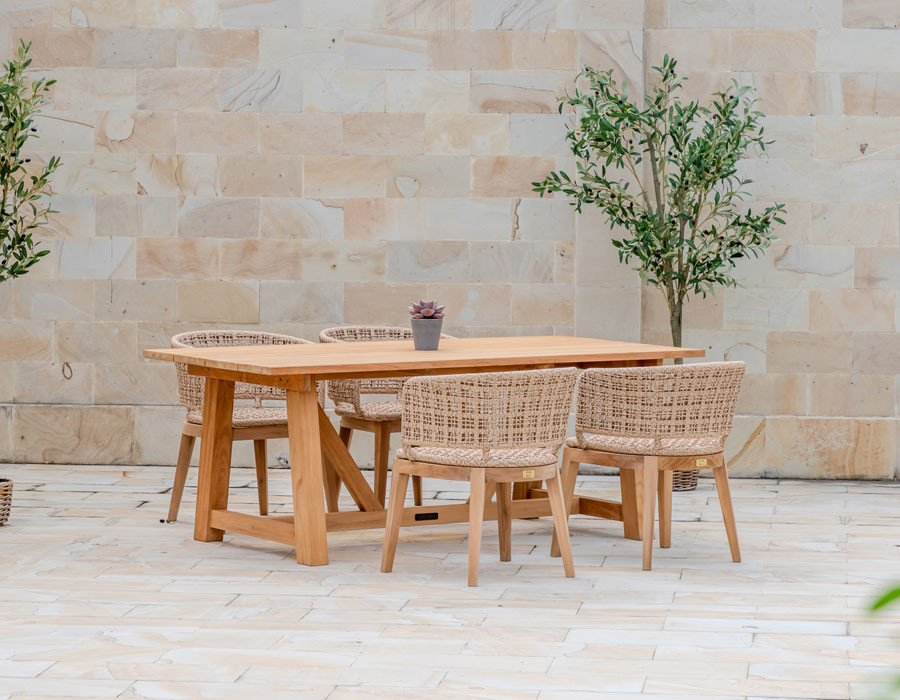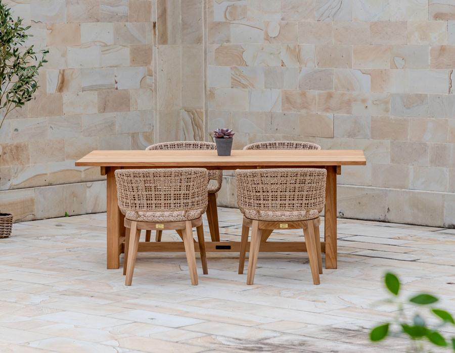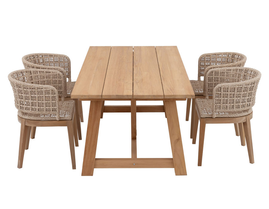 Skab en indbydende spiseplads i uderummet med Balder kerneteak havebordet og 4 Rima havestole i et harmonisk, naturligt udtryk. Bordet er udført i certificeret kerneteak og har et tidløst design med bløde, afrundede hjørner, der giver et elegant og let look på terrassen.