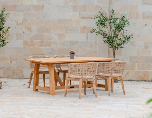 Skab en indbydende spiseplads i uderummet med dette sæt, hvor et karakterfuldt teakbord matches med 6 Rima havestole. Bordet er fremstillet i kerneteak fra plantage i Indonesien og står på et konisk understel med lameller, som giver et let, elegant udtryk og samtidig høj stabilitet. Den centrale base betyder, at du får god benplads hele vejen rundt, uden...
