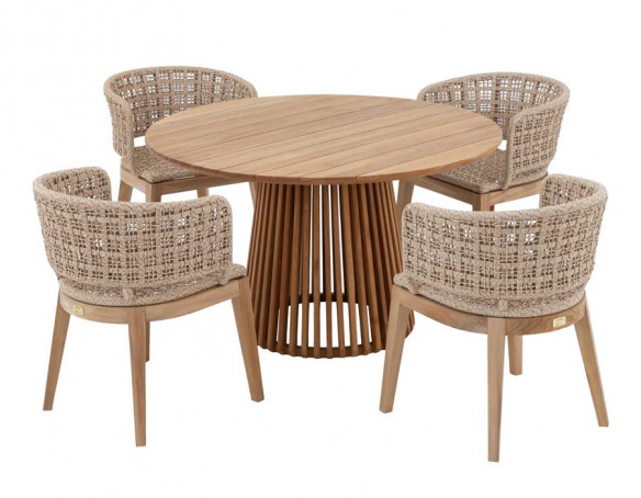 Skab en indbydende spiseplads i uderummet med dette sæt, hvor et karakterfuldt teakbord matches med 6 Rima havestole. Bordet er fremstillet i kerneteak fra plantage i Indonesien og står på et konisk understel med lameller, som giver et let, elegant udtryk og samtidig høj stabilitet. Den centrale base betyder, at du får god benplads hele vejen rundt, uden...